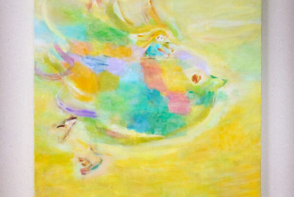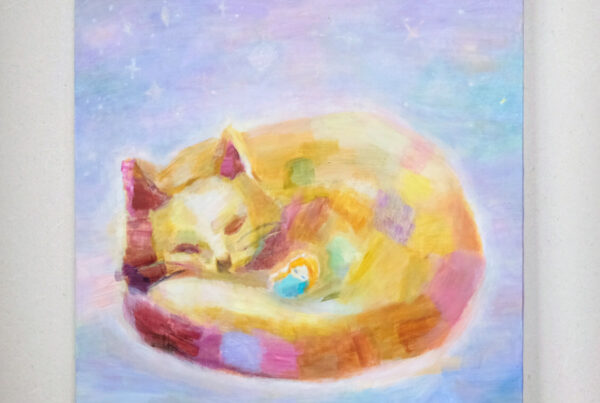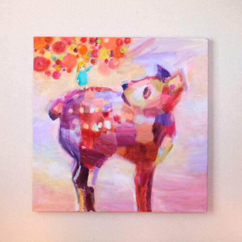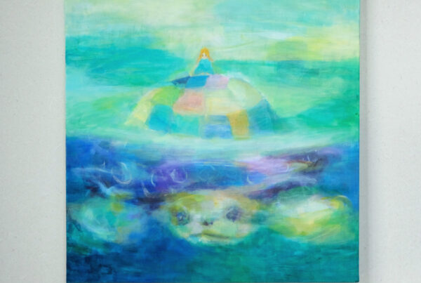 2 へとへとになって 泣きつかれても ひとくち かむたび いのちが また かがやいてく 「たべる たべる いきる」 65×65cm, キャンバスにリキテックス 以前描いた「かわいんりょく」の絵の中に ロレッタが訪れて お話が広がっていきます。 b-ex50周年という特別な節目に生まれた 5枚の絵、その2です。 今回は筆を極力使わず、短めの ブラシを使って描いています。 八ヶ岳にすむ いきもの「やつにまる」