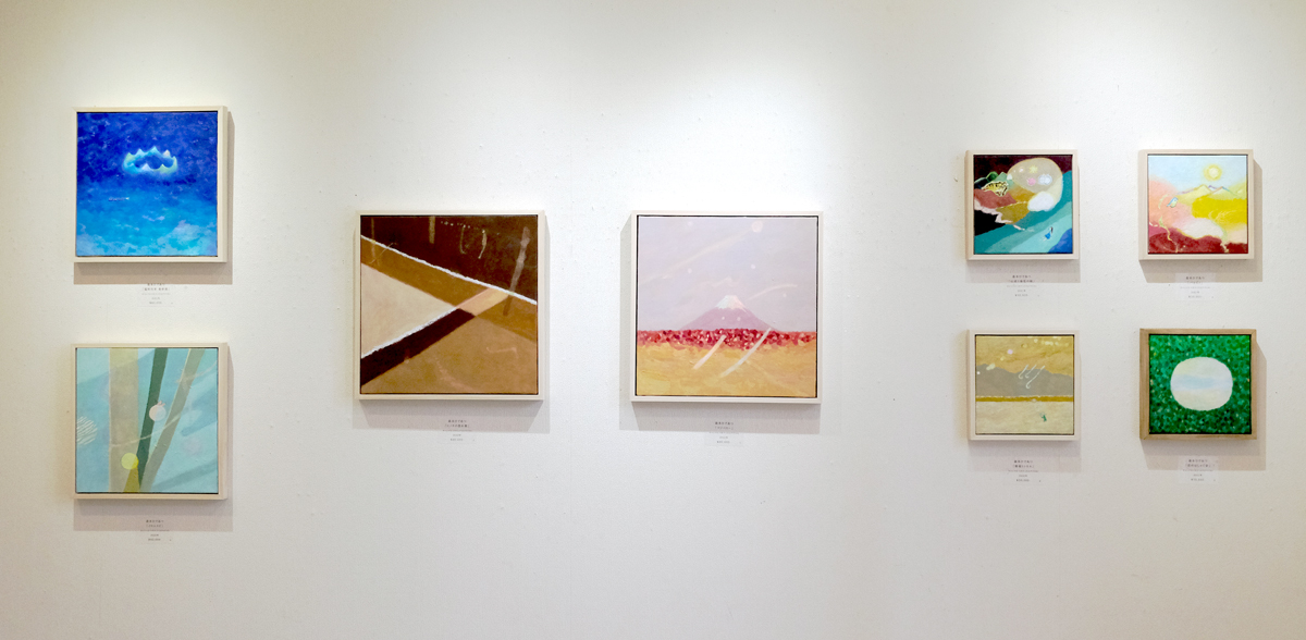 原画は正方形の作品8点。自分で作った木製フレームで飾りました。 よりシンプルに色数を抑えめにした表現や、画面中にトンパ文字や、視覚化できない思いを表す漢字を溶け込ませたり、新しい描き方に挑み、こうして展示できたことを嬉しく思います。