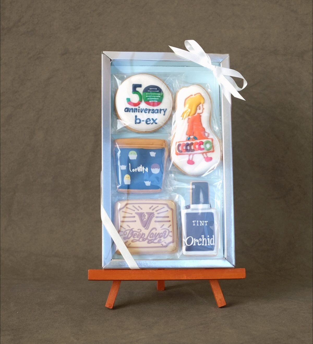 b-ex社の50周年のお祝いのなかで、 この瞬間だけ生まれたロレッタの限定品 1 シャンパンラベル 王様が杖をもったフォルムになっています。 お城の中には、トランプの4種類のマークが 隠れています♦️ 2 アイシングクッキー 今年新しく生まれたグリースなどが可愛い お菓子になりました 3 社史には線画とお祝いの言葉を描き添えました これまで描いてきたイラストが、 お目出たい節目に新しい形として 立ち現れたこと、 とても嬉しく思います。 関わってくださった皆さまに感謝です🎨 これこらもロレッタの物語が 日々の暮らしのなかに 心地よく寄り添いますように💫